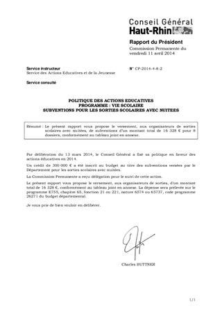 Le présent rapport vous propose le versement, aux organisateurs de sorties scolaires avec nuitées, de subventions d’un montant total de 16 328 € pour 8 dossiers, conformément au tableau joint en annexe.