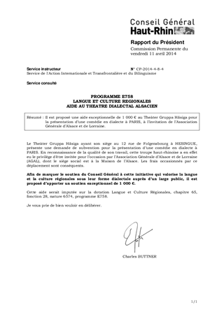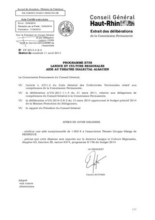 Il est proposé une aide exceptionnelle de 1 000 € au Theàter Gruppa Häsiga pour la présentation d’une comédie en dialecte à PARIS, à l’invitation de l’Association Générale d’Alsace et de Lorraine.