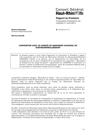 CONVENTION AVEC LE COMITE DU MONUMENT NATIONAL DU HARTMANNSWILLERKOPF