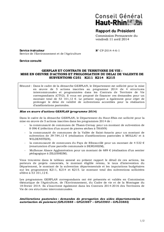 Dans le cadre de la démarche GERPLAN, le Département est sollicité pour la mise en œuvre de 5 actions inscrites au programme 2014 de 4 structures intercommunales et programmées dans les Contrats de Territoire de Vie correspondants (CTV2). Il vous est proposé de financer ces demandes pour un montant total de 53 101,12 €. Le présent rapport a également pour objet de prolonger le délai de validité de subventions accordées pour la réalisation d’améliorations pastorales.