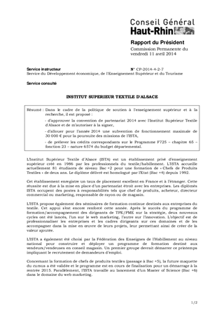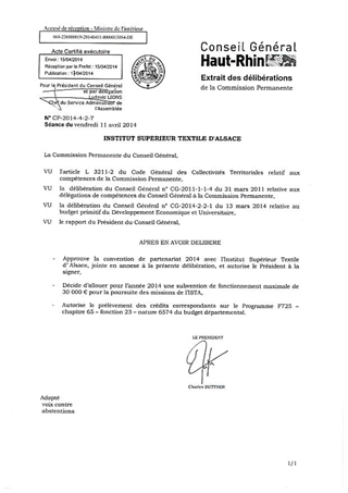 Dans le cadre de la politique de soutien à l'enseignement supérieur et à la recherche, il est proposé : - d’approuver la convention de partenariat 2014 avec l'Institut Supérieur Textile d'Alsace et de m’autoriser à la signer, - d’allouer pour l’année 2014 une subvention de fonctionnement maximale de 30 000 € pour la poursuite des missions de l’ISTA, - de prélever les crédits correspondants sur le Programme F725 – chapitre 65 – fonction 23 – nature 6574 du budget départemental.