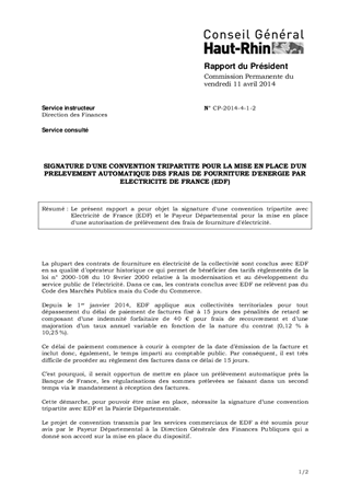 Le présent rapport a pour objet la signature d'une convention tripartite avec Electricité de France (EDF) et le Payeur Départemental pour la mise en place d'une autorisation de prélèvement des frais de fourniture d'électricité.