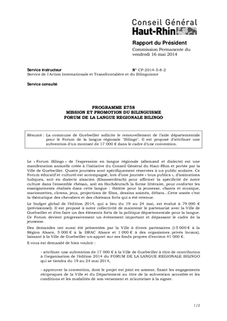 La commune de Guebwiller sollicite le renouvellement de l’aide départementale pour le Forum de la langue régionale "Bilingo". Il est proposé d’attribuer une subvention d'un montant de 17 000 € dans le cadre d’une convention.