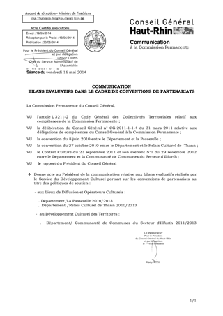 Informations relatives aux bilans évaluatifs réalisés par le Service du Développement Culturel portant sur 3 partenariats au titre des politiques de soutien : - aux Lieux de Diffusion et Opérateurs Culturels : . Département/La Passerelle 2010/2013 . Département/Relais Culturel de Thann 2010/2013 - au Développement Culturel des Territoires : . Département/Communauté de Communes du Secteur d'Illfurth 2011/2013