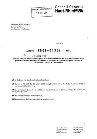 portant fixation de la dotation globale de fonctionnement au titre de l'exercice 2006 pour le service d'accompagnement à la vie sociale de l'institut pour déficients sensoriels "Le Phare" à ILLZACH. Resumé Pièces jointes ARRETE Assemblée : Non défini Date : 26/06/2006 Rapporteur : Non défini Collectivité : Conseil départemental du Haut-Rhin Direction : Non défini Service : Service de la Tarification des Etablissements Domaine : Dotations financières Commission :