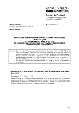 PROGRAMME DÉPARTEMENTAL D'AMÉNAGEMENT DES RIVIÈRES C414 C214 C114 APPROBATION DES OPÉRATIONS 2014 ET DÉLÉGATION DE LA MAÎTRISE D'OUVRAGE AU DÉPARTEMENT SUBVENTIONS AUX COLLECTIVITÉS