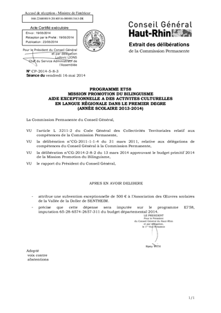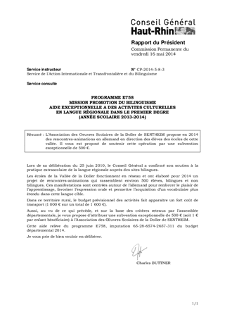L’Association des Oeuvres Scolaires de la Doller de SENTHEIM propose en 2014 des rencontres-animations en allemand en direction des élèves des écoles de cette vallée. Il vous est proposé de soutenir cette opération par une subvention exceptionnelle de 500 €.