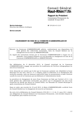 La Commune d’AMMERZWILLER sollicite, conformément aux dispositions du Code général des collectivités territoriales, l’avis du Conseil Général sur le changement de son nom en AMMERTZWILLER. Au regard des motivations émises par la Commune d’AMMERZWILLER à l’appui de sa demande, il est proposé d’émettre un avis favorable au changement de nom de la Commune d’AMMERZWILLER en AMMERTZWILLER.