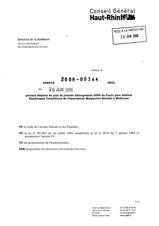 portant fixation du prix de journée hébergement 2006 du foyer pour adultes handicapés travailleurs de l'association Marguerite Sinclair à MULHOUSE. Resumé Pièces jointes ARRETE Assemblée : Non défini Date : 26/06/2006 Rapporteur : Non défini Collectivité : Conseil départemental du Haut-Rhin Direction : Non défini Service : Service de la Tarification des Etablissements Domaine : Prix de Journée Commission :