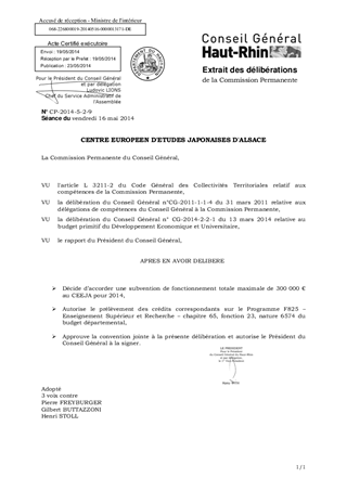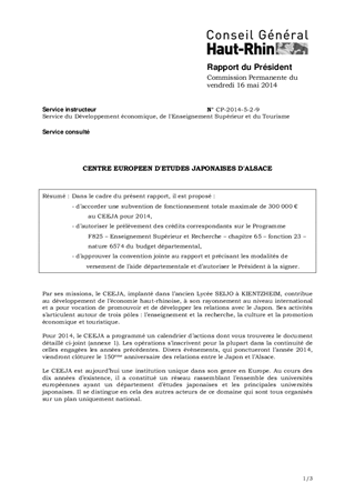 Dans le cadre du présent rapport, il est proposé : - d’accorder une subvention de fonctionnement totale maximale de 300 000 € au CEEJA pour 2014, - d’autoriser le prélèvement des crédits correspondants sur le Programme F825 – Enseignement Supérieur et Recherche – chapitre 65 – fonction 23 – nature 6574 du budget départemental, - d’approuver la convention jointe au rapport et précisant les modalités de versement de l’aide départementale et d’autoriser le Président à la signer.