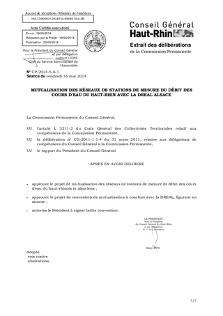 Le Département a mis en place depuis 2007 un réseau de 31 stations de mesure du débit des cours d'eau et informe le grand public sur le site www.infogeo68.fr. En 2010 le dispositif a été complété par une prévision des débits à 10 jours qui permet d'anticiper les crues. Ce système de surveillance représente un coût de fonctionnement de 60 000 € par an qui pourrait être ramené à 30 000 € en mutualisant nos stations de mesure avec le réseau de l'Etat, représenté par la DREAL Alsace. Nous conserverions 15 stations de mesure, ainsi que la prévision des débits à 10 jours, la DREAL Alsace assurant la maintenance courante et la collecte des données en temps réel. Pour permettre cette mutualisation qui nous fera économiser 30 000 € de crédits de fonctionnement chaque année, il vous est proposé de m'autoriser à signer la convention avec la DREAL Alsace.