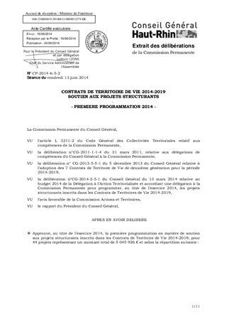 Il est proposé de valider la première programmation pour l’année 2014 des aides à attribuer aux projets structurants inscrits dans les Contrats de Territoire de Vie ( CTV) 2014-2019. 44 projets sont concernés pour un montant total de 5 045 926 € réparti de la façon suivante : - CTV Piémont – Val d’Argent – Pays Welche : 313 461 € pour 5 projets ; - CTV Colmar, Fecht et Ried : 1 359 950 € pour 10 projets ; - CTV Florival – Vignoble – Plaine du Rhin : 669 095 € pour 8 projets ; - CTV Thur-Doller : 64 500 € pour 2 projets ; - CTV de la Région Mulhousienne : 2 065 226 € pour 3 projets ; - CTV des Trois Pays : 392 368 € pour 8 projets ; - CTV du Sundgau : 181 326 € pour 8 projets.