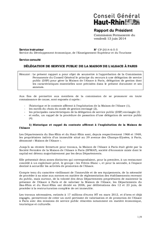 Le présent rapport a pour objet de soumettre à l'approbation de la Commission Permanente du Conseil Général le principe du recours à une délégation de service public (DSP) pour gérer la Maison de l'Alsace à Paris, délégation de gestion dont les caractéristiques essentielles sont précisées dans le présent document et ses annexes.