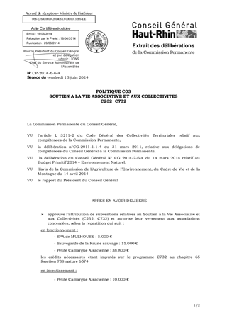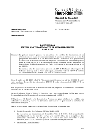 Le présent rapport propose la répartition des crédits de fonctionnement et d'investissement entre diverses associations et syndicats mixtes dans le cadre du programme de Soutien à la Vie Associative et aux Collectivités. Ces propositions d’attribution de subventions ont été préparées conformément aux crédits prévus dans le cadre du BP 2014 et ont obtenu un avis favorable de la Commission de l'Agriculture, de l'Environnement, du Cadre de Vie et de la Montagne, réunie le 14 avril 2014. Le montant total des subventions proposé à la SPA de Mulhouse, à Sauvegarde de la Faune Sauvage et à la Petite Camargue Alsacienne s’élève à 58 800 € au titre du fonctionnement et à 10 000 € au titre de l’investissement.