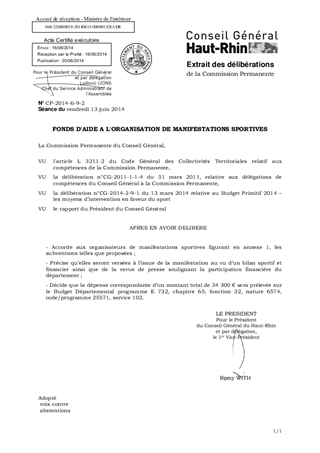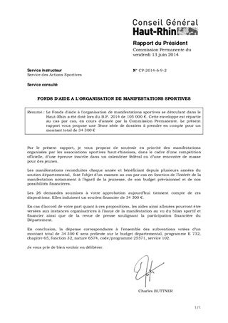 Le Fonds d'aide à l'organisation de manifestations sportives se déroulant dans le Haut-Rhin a été doté lors du B.P. 2014 de 105 000 €. Cette enveloppe est répartie au cas par cas, en cours d'année par la Commission Permanente. Le présent rapport vous propose une 3ème série de dossiers à prendre en compte pour un montant total de 34 300 €