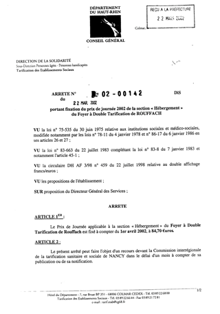 Portant fixation des prix de journée 2002 de la section hébergement du foyer à double tarification de ROUFFACH Resumé Pièces jointes ARRETE Assemblée : Non défini Date : 22/03/2002 Rapporteur : Non défini Collectivité : Conseil départemental du Haut-Rhin Direction : Non défini Service : Service de la Tarification des Etablissements Domaine : Prix de Journée Commission :