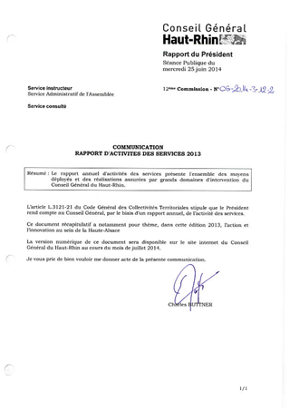 Le rapport annuel d'activités des services présente l'ensemble des moyens déployés et des réalisations assurées par grands domaines d'intervention du Conseil Général du Haut-Rhin.