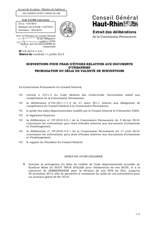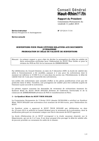 Le présent rapport a pour objet de décider la prorogation du délai de validité de deux subventions attribuées pour l'élaboration du SCOT Thur Doller et pour la révision du POS en PLU de la commune de ZIMMERSHEIM.
