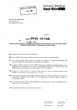 portant autorisation de création d'une Maison d'Accueil Rurale pour Personnes Agées (MARPA) à Sentheim et habilitation à l'aide sociale Resumé Pièces jointes ARRETE Assemblée : Non défini Date : 04/07/2006 Rapporteur : Non défini Collectivité : Conseil départemental du Haut-Rhin Direction : Non défini Service : Service de la Tarification des Etablissements Domaine : Personnes Agées Commission :
