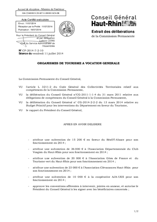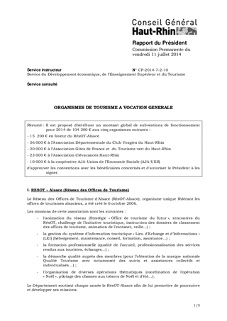 Il est proposé d’attribuer un montant global de subventions de fonctionnement pour 2014 de 104 200 € aux cinq organismes suivants : - 15 200 € en faveur du RésOT-Alsace - 36 000 € à l’Association Départementale du Club Vosgien du Haut-Rhin - 20 000 € à l’Association Gîtes de France et du Tourisme vert du Haut-Rhin - 23 000 € à l’Association Clévacances Haut-Rhin - 10 000 € à la coopérative AJA-Union de l’Economie Sociale (AJA-UES) d’approuver les conventions avec les bénéficiaires concernés et d'autoriser le Président à les signer.
