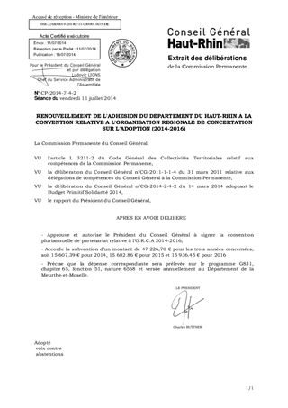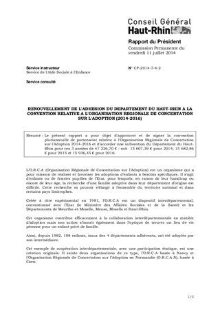 RENOUVELLEMENT DE L'ADHESION DU DEPARTEMENT DU HAUT-RHIN A LA CONVENTION RELATIVE A L'ORGANISATION REGIONALE DE CONCERTATION SUR L'ADOPTION (2014-2016)