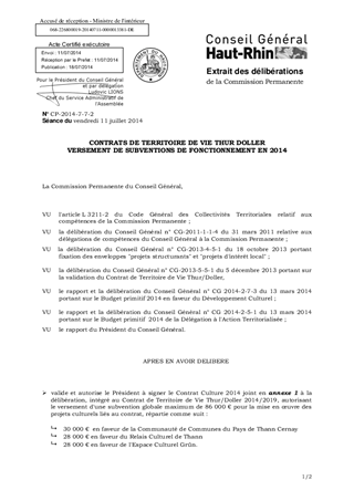 CONTRATS DE TERRITOIRE DE VIE THUR DOLLER VERSEMENT DE SUBVENTIONS DE FONCTIONNEMENT EN 2014