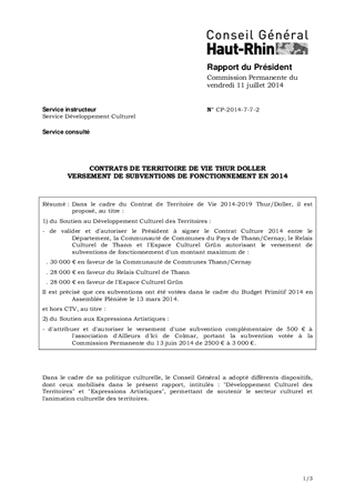 Dans le cadre du Contrat de Territoire de Vie 2014-2019 Thur/Doller, il est proposé, au titre : 1) du Soutien au Développement Culturel des Territoires : - de valider et d'autoriser le Président à signer le Contrat Culture 2014 entre le Département, la Communauté de Communes du Pays de Thann/Cernay, le Relais Culturel de Thann et l'Espace Culturel Grün autorisant le versement de subventions de fonctionnement d'un montant maximum de : . 30 000 € en faveur de la Communauté de Communes Thann/Cernay . 28 000 € en faveur du Relais Culturel de Thann . 28 000 € en faveur de l'Espace Culturel Grün Il est précisé que ces subventions ont été votées dans le cadre du Budget Primitif 2014 en Assemblée Plénière le 13 mars 2014. et hors CTV, au titre : 2) du Soutien aux Expressions Artistiques : - d'attribuer et d'autoriser le versement d'une subvention complémentaire de 500 € à l'association d'Ailleurs d'Ici de Colmar, portant la subvention votée à la Commission Permanente du 13 juin 2014 de 2500 € à 3 000 €.