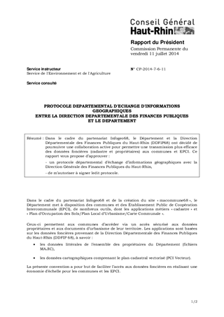 Dans le cadre du partenariat Infogeo68, le Département et la Direction Départementale des Finances Publiques du Haut-Rhin (DDFiP68) ont décidé de poursuivre une collaboration active pour permettre une transmission plus efficace des données foncières (cadastre et propriétaires) aux communes et EPCI. Ce rapport vous propose d’approuver : - un protocole départemental d’échange d’informations géographiques avec la Direction Générale des Finances Publiques du Haut-Rhin, - de m’autoriser à signer ledit protocole.