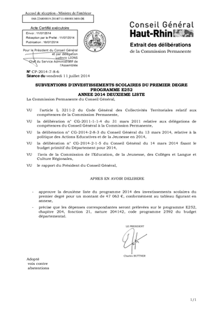 SUBVENTIONS D'INVESTISSEMENTS SCOLAIRES DU PREMIER DEGRE PROGRAMME E252 ANNEE 2014 DEUXIEME LISTE