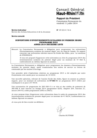 La Commission Permanente a délégation pour programmer les subventions d’investissements scolaires du premier degré, tout au long de l’année. Ce rapport concerne une subvention relevant encore du Guide des Aides, pour la commune de STEINBACH. Il vous est proposé d’approuver cette subvention au titre du programme 2014 des investissements scolaires du premier degré pour un montant de 47 063 €, conformément au tableau figurant en annexe.