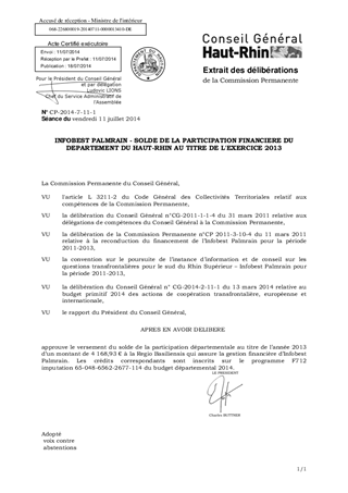 INFOBEST PALMRAIN - SOLDE DE LA PARTICIPATION FINANCIERE DU DEPARTEMENT DU HAUT-RHIN AU TITRE DE L'EXERCICE 2013