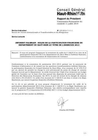 Il vous est proposé d'approuver le versement du solde de 4 168,93 € au titre de la participation financière 2013 du Département du Haut-Rhin à l'Infobest Palmrain, conformément à la convention de financement de l'instance.