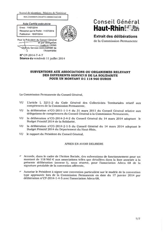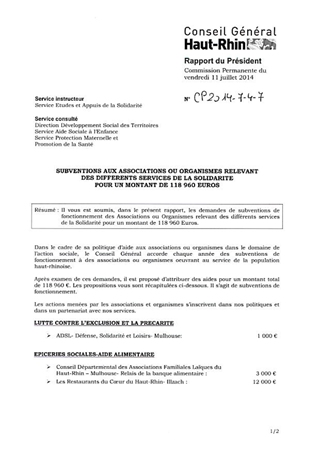 SUBVENTIONS AUX ASSOCIATIONS OU ORGANISMES RELEVANT DES DIFFERENTS SERVICES DE LA SOLIDARITE POUR UN MONTANT DE 118 960 EUROS Resumé Pièces jointes DELIBERATION RAPPORT Assemblée : Commission Permanente Date : 11/07/2014 Rapporteur : Non défini Collectivité : Conseil départemental du Haut-Rhin Direction : Non défini Service : Service des Etudes et d'Appuis de la Solidarité Domaine : Social / Solidarité Commission : Commission Permanente