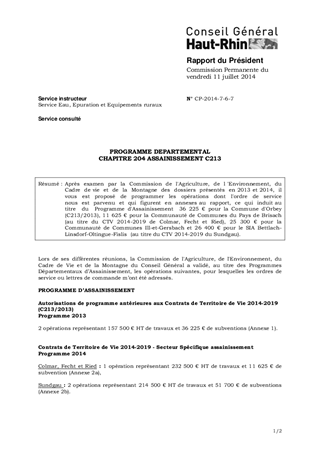 Après examen par la Commission de l'Agriculture, de l 'Environnement, du Cadre de vie et de la Montagne des dossiers présentés en 2013 et 2014, il vous est proposé de programmer les opérations dont l'ordre de service nous est parvenu et qui figurent en annexes au rapport, ce qui induit au titre du Programme d'Assainissement 36 225 € pour la Commune d'Orbey (C213/2013), 11 625 € pour la Communauté de Communes du Pays de Brisach (au titre du CTV 2014-2019 de Colmar, Fecht et Ried), 25 300 € pour la Communauté de Communes Ill-et-Gersbach et 26 400 € pour le SIA Bettlach-Linsdorf-Oltingue-Fislis (au titre du CTV 2014-2019 du Sundgau).