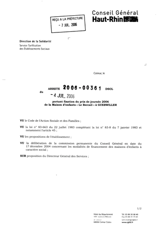 portant fixation du prix de journée 2006 de la Maison d'enfants "Le Bercail" à Guebwiller Resumé Pièces jointes ARRETE Assemblée : Non défini Date : 04/07/2006 Rapporteur : Non défini Collectivité : Conseil départemental du Haut-Rhin Direction : Non défini Service : Service de la Tarification des Etablissements Domaine : Prix de Journée Commission :