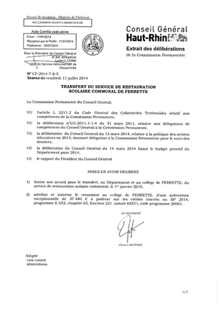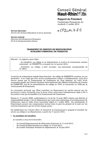 TRANSFERT DU SERVICE DE RESTAURATION SCOLAIRE COMMUNAL DE FERRETTE Resumé Pièces jointes DELIBERATION RAPPORT Assemblée : Commission Permanente Date : 11/07/2014 Rapporteur : Non défini Collectivité : Conseil départemental du Haut-Rhin Direction : Non défini Service : Service des Actions Éducatives Domaine : Education Commission : Commission Permanente