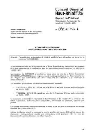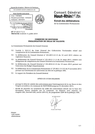 COMMUNE DE SENTHEIM PROLONGATION DE DELAI DE VALIDITE Resumé Pièces jointes DELIBERATION RAPPORT Assemblée : Commission Permanente Date : 11/07/2014 Rapporteur : Non défini Collectivité : Conseil départemental du Haut-Rhin Direction : Non défini Service : Pôle Gestion du Domaine et Finances Domaine : Transports / Routes Commission : Commission Permanente