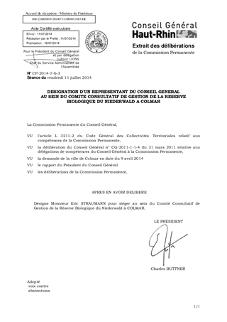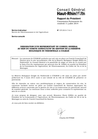 La commune de COLMAR souhaite que soit mis en place un Comité Consultatif de Gestion pour le site nouvellement créé de la Réserve Biologique Dirigée (RBD) du Niederwald. Le Conseil Général a la possibilité de siéger au sein de ce comité par le biais d’un élu représentant qui pourrait être M. GSELL en qualité de Président de la Commission de l'Agriculture, de l'Environnement, du Cadre de Vie et de la Montagne.