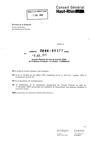portant fixation du prix de journée 2006 de la Maison d'enfants "Le Chalet" à Rimbach Resumé Pièces jointes ARRETE Assemblée : Non défini Date : 06/07/2006 Rapporteur : Non défini Collectivité : Conseil départemental du Haut-Rhin Direction : Non défini Service : Service de la Tarification des Etablissements Domaine : Prix de Journée Commission :