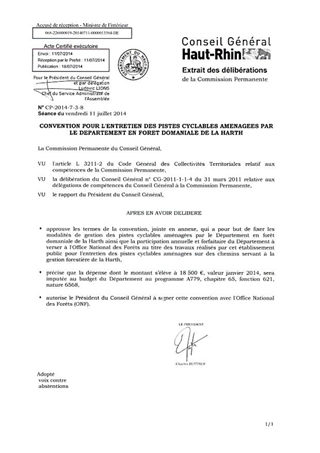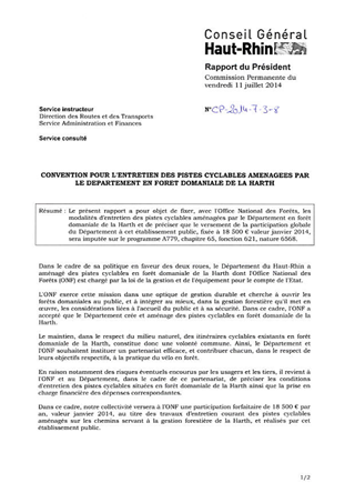 CONVENTION POUR L'ENTRETIEN DES PISTES CYCLABLES AMENAGEES PAR LE DEPARTEMENT EN FORET DOMANIALE DE LA HARTH Resumé Pièces jointes DELIBERATION RAPPORT Assemblée : Commission Permanente Date : 11/07/2014 Rapporteur : Non défini Collectivité : Conseil départemental du Haut-Rhin Direction : Non défini Service : Pôle Gestion du Domaine et Finances Domaine : Aides / Subventions Commission : Commission Permanente