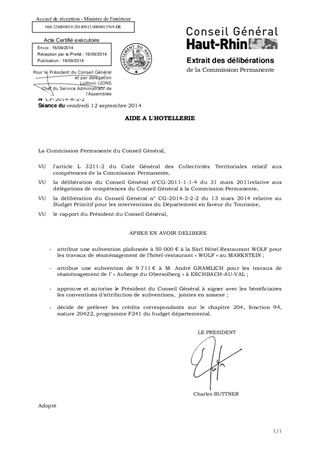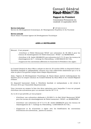 Il est proposé : - d'attribuer à l’Hôtel Restaurant WOLF une subvention de 50 000 € pour les travaux de réaménagement de l’hôtel restaurant « WOLF » au MARKSTEIN, - d’attribuer à M. André GRAMLICH une subvention de 9 711 € pour les travaux de réaménagement de l’ « Auberge du Obersolberg » à ESCHBACH-AU-VAL, - d'approuver les conventions afférentes et d'autoriser le Président à les signer.