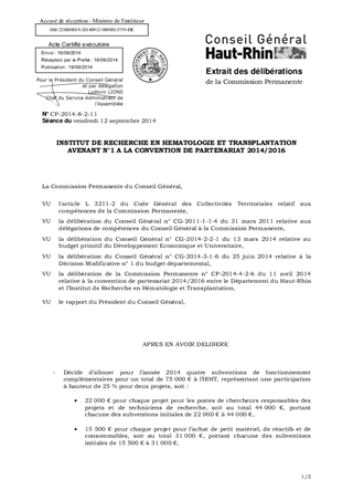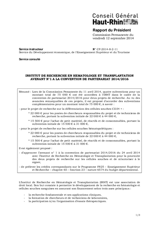 Lors de la Commission Pemanente du 11 avril 2014, quatre subventions pour un montant total de 75 000 € ont été accordées à l'IRHT dans le cadre de la convention de partenariat 2014/2016 pour deux projets de recherche. Au vu des avancées remarquables de ces projets, il est proposé d'accorder des subventions complémentaires pour un montant total de 75 000 €, à savoir : - pour le projet de recherche sur la différenciation des cellules souches CD34 + : * 22 000 € pour les postes de chercheurs responsables du projet et de techniciens de recherche, portant la subvention initiale de 22 000 € à 44 000 €, * 15 500 € pour l'achat de petit matériel, de réactifs et de consommables, portant la subvention initiale de 15 500 € à 31 000 €, - pour le projet de recherche sur les cellules souches hématopoïétiques : * 22 000 € pour les postes de chercheurs responsables du projet et de techniciens de recherche, portant la subvention initiale de 22 000 € à 44 000 €, * 15 500 € pour l'achat de petit matériel, de réactifs et de consommables, portant la subvention initiale de 15 500 € à 31 000 €. Il est également proposé : - d’approuver l’avenant n° 1 à la convention de partenariat 2014/2016 du 24 avril 2014 avec l’Institut de Recherche en Hématologie et Transplantation pour la poursuite des deux projets de recherche sur les cellules souches et de m’autoriser à le signer, - de prélever les crédits correspondants sur le Programme F825 – Enseignement Supérieur et Recherche – chapitre 65 – fonction 23 – nature 6574 du budget départemental.