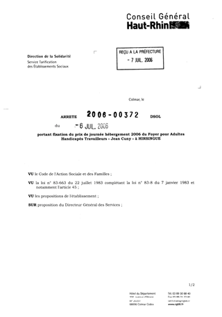 portant fixation du prix de journée hébergement 2006 du Foyer pour Adultes Handicapés Travailleurs "Jean Cuny" à Hirsingue Resumé Pièces jointes ARRETE Assemblée : Non défini Date : 06/07/2006 Rapporteur : Non défini Collectivité : Conseil départemental du Haut-Rhin Direction : Non défini Service : Service de la Tarification des Etablissements Domaine : Prix de Journée Commission :