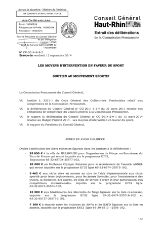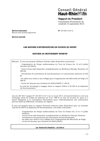 Il vous est proposé d’allouer diverses aides financières concernant : - l’organisation de l’étape mulhousienne du Tour de France les 13 et14 juillet derniers (25 000 €) - l’octroi d’une aide financière complémentaire au Mulhouse Olympic Natation (10 000 €)) - l’attribution de subventions de fonctionnement à 8 associations sportives (5 465 €) - les aides aux clubs et aux collèges pour l’organisation des Mercredis de Neige (15 000 €) - l’octroi de bourses aux titulaires du BAFA/BAFD (7 100 €) Le total de l’enveloppe à engager dans ce rapport s’élève à 62 565 € en dépenses de fonctionnement.
