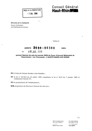 portant fixation du prix de journée 2006 du Foyer d'Accueil Médicalisé de l'Association "Les Tournesols" à Sainte Marie aux Mines Resumé Pièces jointes ARRETE Assemblée : Non défini Date : 06/07/2006 Rapporteur : Non défini Collectivité : Conseil départemental du Haut-Rhin Direction : Non défini Service : Service de la Tarification des Etablissements Domaine : Prix de Journée Commission :