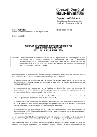 Dans le cadre de la démarche GERPLAN, le Département est sollicité pour la mise en œuvre de 7 actions inscrites au programme 2014 de 5 structures intercommunales et programmées dans les Contrats de Territoire de Vie correspondants (CTV 2014-2019). Il vous est proposé de financer ces demandes pour un montant total de 12 994 €.