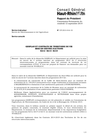 GERPLAN ET CONTRATS DE TERRITOIRE DE VIE MISE EN OEUVRE D'ACTIONS K212 K214 K215