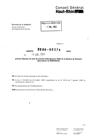 portant fixation du prix de journée hébergement 2006 de la Maison de Retraite Spécialisée de Hirsingue Resumé Pièces jointes ARRETE Assemblée : Non défini Date : 06/07/2006 Rapporteur : Non défini Collectivité : Conseil départemental du Haut-Rhin Direction : Non défini Service : Service de la Tarification des Etablissements Domaine : Prix de Journée Commission :