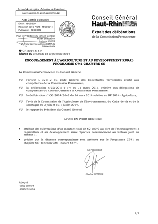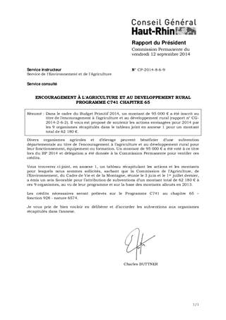 Dans le cadre du Budget Primitif 2014, un montant de 95 000 € a été inscrit au titre de l’encouragement à l’agriculture et au développement rural (rapport n° CG-2014-2-6-2). Il vous est proposé de soutenir les actions envisagées pour 2014 par les 9 organismes récapitulés dans le tableau joint en annexe 1 pour un montant total de 62 180 €.