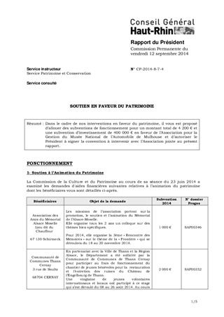 Dans le cadre de nos interventions en faveur du patrimoine, il vous est proposé d’allouer des subventions de fonctionnement pour un montant total de 4 200 € et une subvention d’investissement de 400 000 € en faveur de l’Association pour la Gestion du Musée National de l’Automobile de Mulhouse et d’autoriser le Président à signer la convention à intervenir avec l’Association jointe au présent rapport.